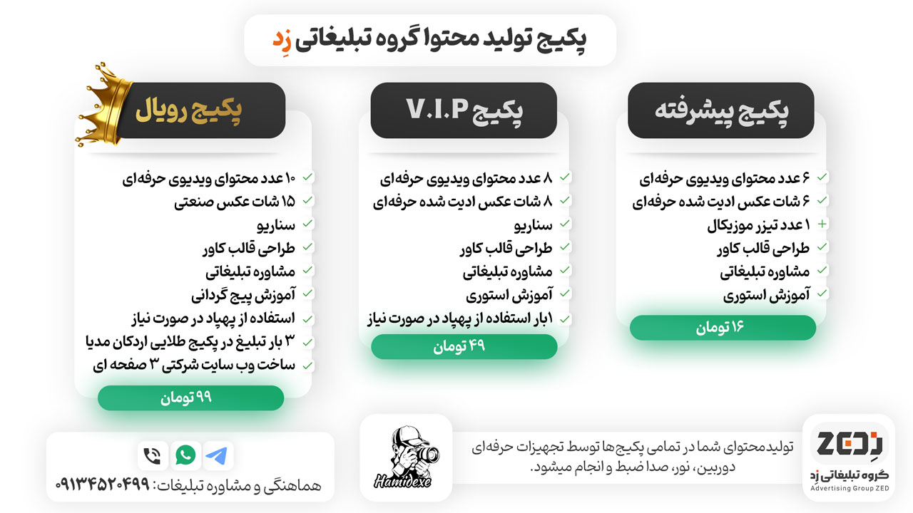 در این پکیج پست، ریلز و عکاسی توسط دوربین حرفه ای تولید محتوا، تجهیزات نورپردازی و ضبط صدای حرفه ای انجام میشود همچنین مناسب استوری های شما نیز میباشد.